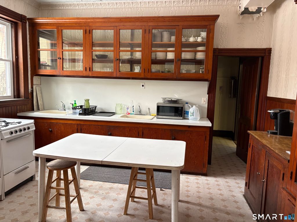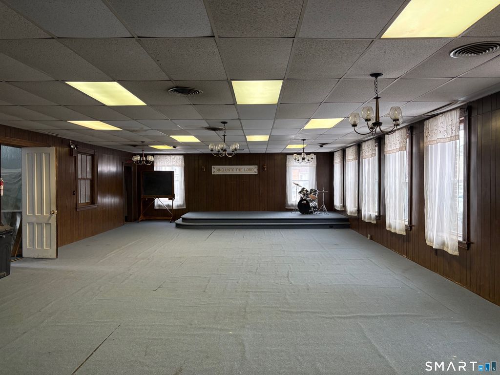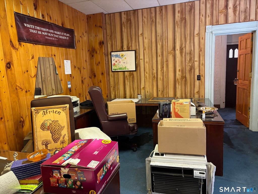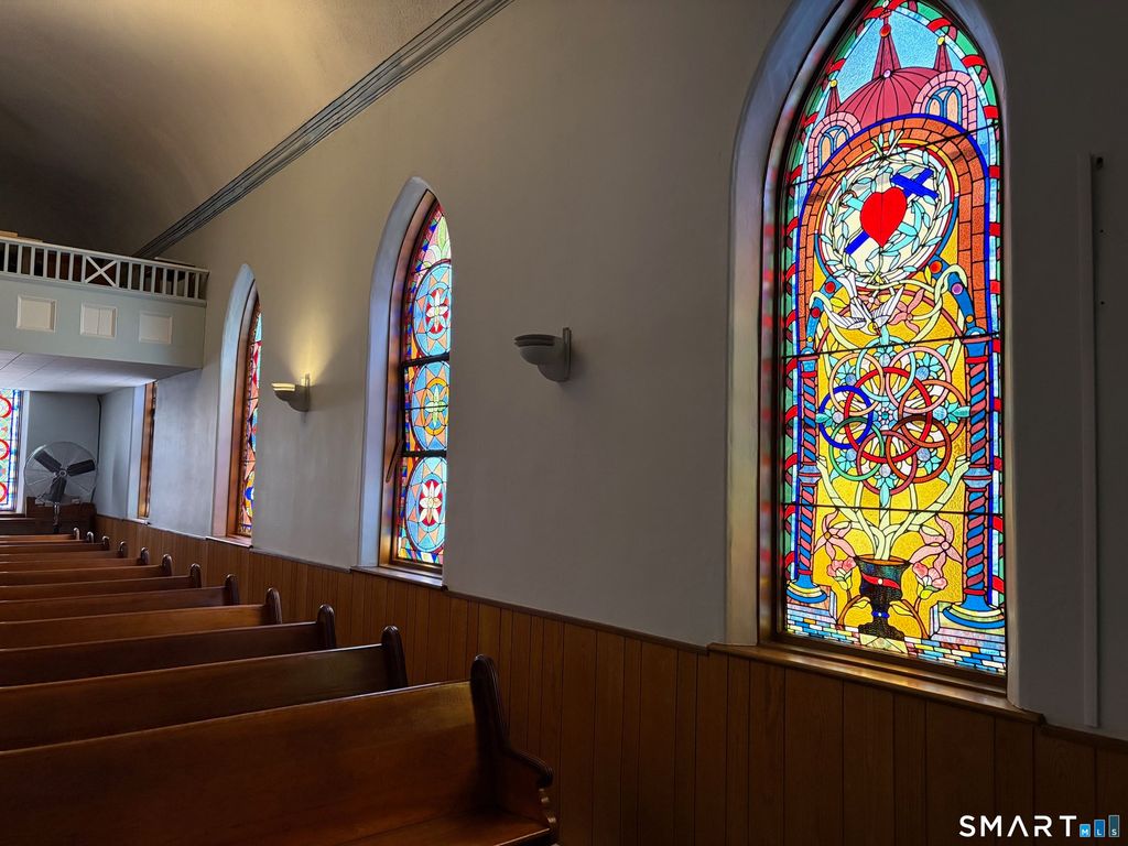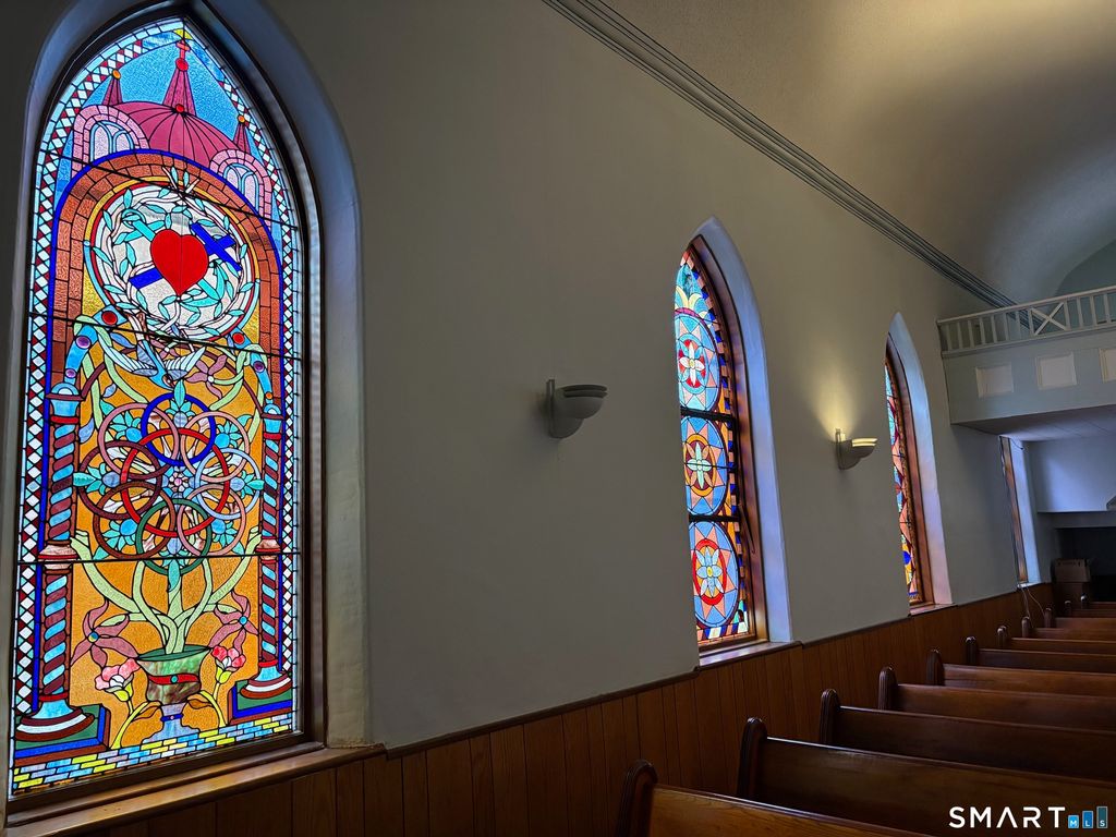 Set between the West End and Hollow neighborhoods of Bridgeport, the property features a 2+ story brick church building, featuring a three-bedroom apartment on the top floor with its own egress. The church was built in 1901, and retains architectural details of the period, as well as stunning stained-glass windows. The sanctuary can hold about 250 people in its ornate wooden pews of the nave and balcony or choir loft. The building measures over 10,000 square feet, and includes a large fellowship hall, media room, kitchen, office, and four classrooms on the lower floor. The property is zoned RX-1, which allows for a range of other uses, including consumer services, funerary services, 3.5-story residential structure with up to three units, group living home, and low impact manufacturing.
