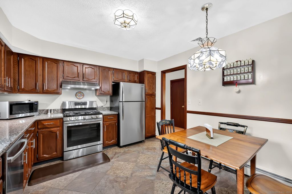 Welcome to Your Immaculately Maintained Raised Ranch Discover this beautifully kept 3/4-bedroom, 2 full and one half bath Raised Ranch, just steps away from the brand new Eli Terry Elementary School, featuring impressive updates! Main Living Areas opens up to a bright and spacious living room with a gas fireplace and hardwood floors throughout the main level.Spacious eat-in kitchen featuring SSteel appliances, and granite countertops. The Dining room, conveniently located off the Living room/kitchen, opens to a four-season porch filled with natural light and recessed lighting, overlooking a 0.57-acre fully fenced yard, perfect for entertaining in any weather. Generously sized bedrooms, including a primary bedroom equipped with a walk-in closet and a remodeled bathroom featuring a tiled stall shower. An additional remodeled full bathroom with a tub on the main floor. The lower level includes 4th bedrooom, or an Office space, Family room with a half bathroom and Laundry area. Access to a charming backyard stone patio throughout a sliding door, creating an inviting area to relax/entertain. You can see pride of ownership reflected in this home's beautiful landscaping! This residence has been lovingly maintained and is ready for its new fortunate homeowners. Recent improvements:Top-of-the-line natural gas heating (Buderus, 2020); Central Air (brand: Amer. Standard, 2020) Updated 200-amp electrical pane (2020); new roof and gutters, sprinkler system in the front