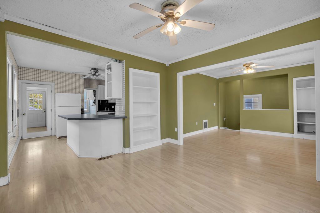 Spacious and full of natural light, this second and third-floor apartment offers a flexible multi-level layout right in the heart of Manchester. The main level features a large open-concept living and dining area with ceiling fans, built-ins, and plenty of windows that create a bright, airy feel. A door from the main living space opens to a private balcony-perfect for enjoying fresh air above the bustle of West Center Street. The kitchen offers ample cabinet and counter space along with a peninsula that opens to the dining area, making it great for both meal prep and entertaining. The third floor includes the home's third bedroom, providing extra privacy or the perfect setup for a guest room or office. Laundry hookups are conveniently located in the unit, and the apartment is currently undergoing remodeling to enhance comfort and modernize the space. Situated on a main road for easy access to local shops, restaurants, and major routes, this apartment combines convenience, space, and charm in a prime Manchester location.