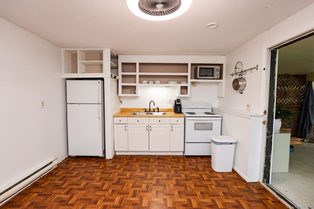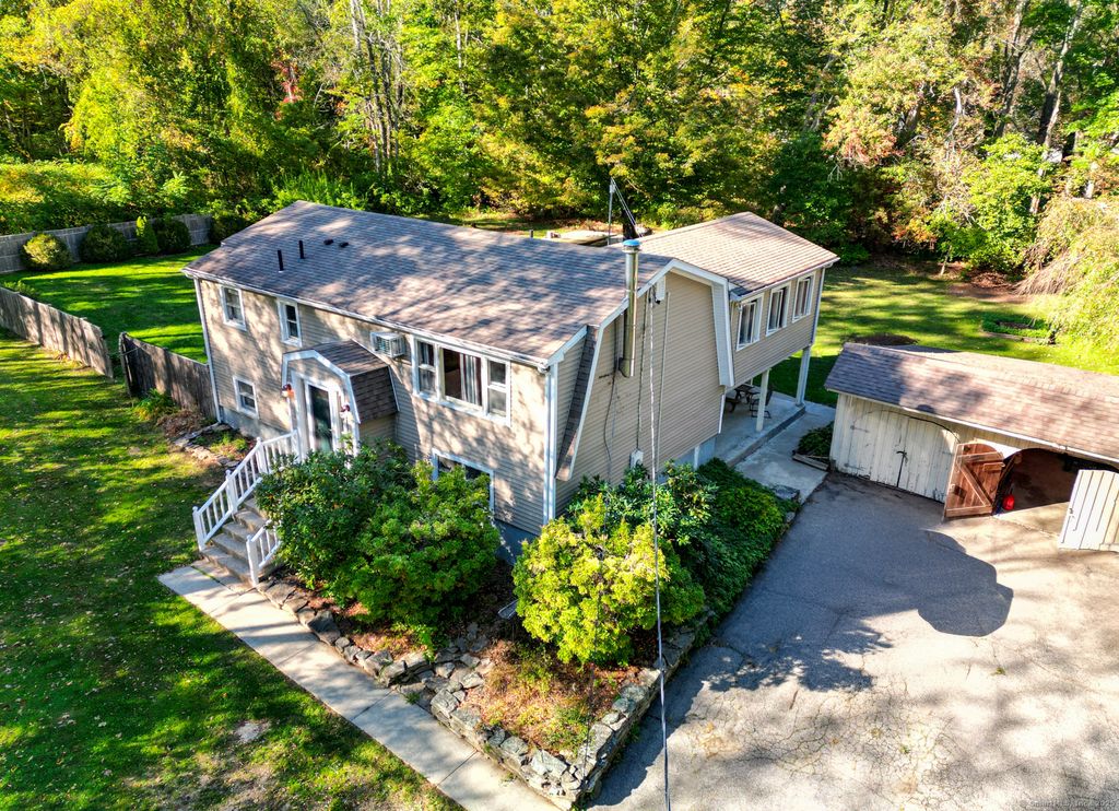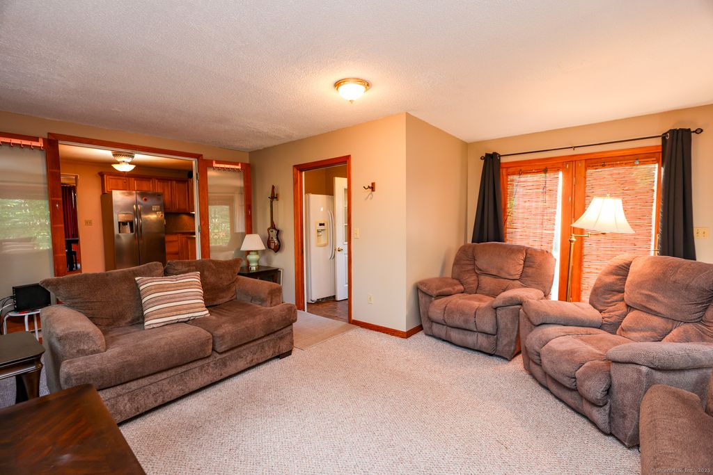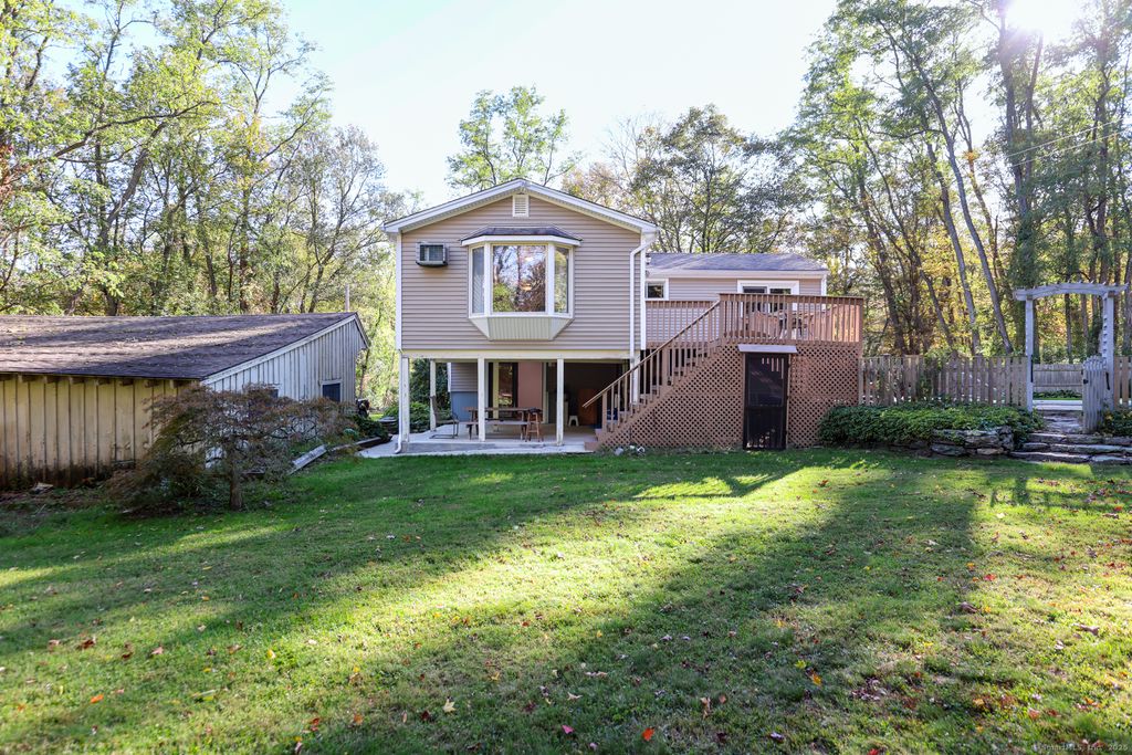 Welcome to 38 White Plains Road - a beautifully maintained raised ranch on 1.38 acres in a peaceful, tree-lined country setting. Designed for comfort and flexibility, this home offers two complete living spaces that function seamlessly together - ideal for multi-generational living, extended family, or guests who want their own space. The main level features two bedrooms, an eat-in kitchen, a living room currently used as a dining room, and a bright family-room addition with a window seat and access to the deck. The spacious primary can easily be converted back into two separate rooms for added versatility. The lower level provides a full in-law setup with its own kitchen, living room, two bedrooms, flex space, bath, laundry, and a walkout to the patio. Outdoors, enjoy the in-ground pool, fire pit, and plenty of storage in the three-car carriage-style garage and large shed with electricity. Surrounded by mature trees, this property blends privacy, comfort, and timeless New England charm. Note: Property will not qualify for government financing because of the garage's condition.