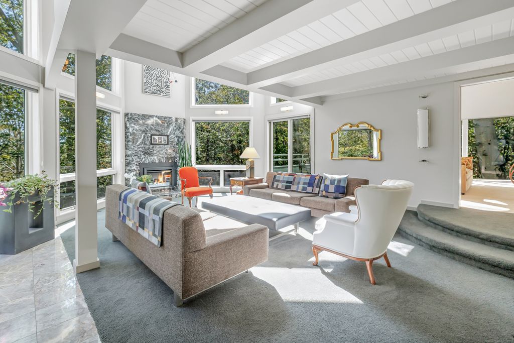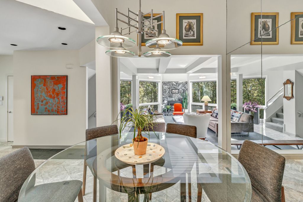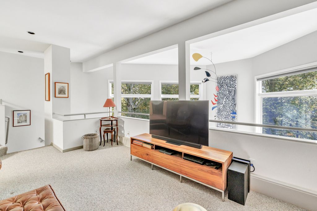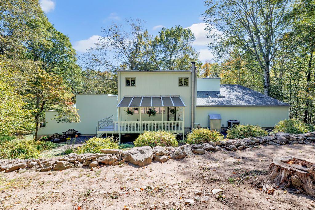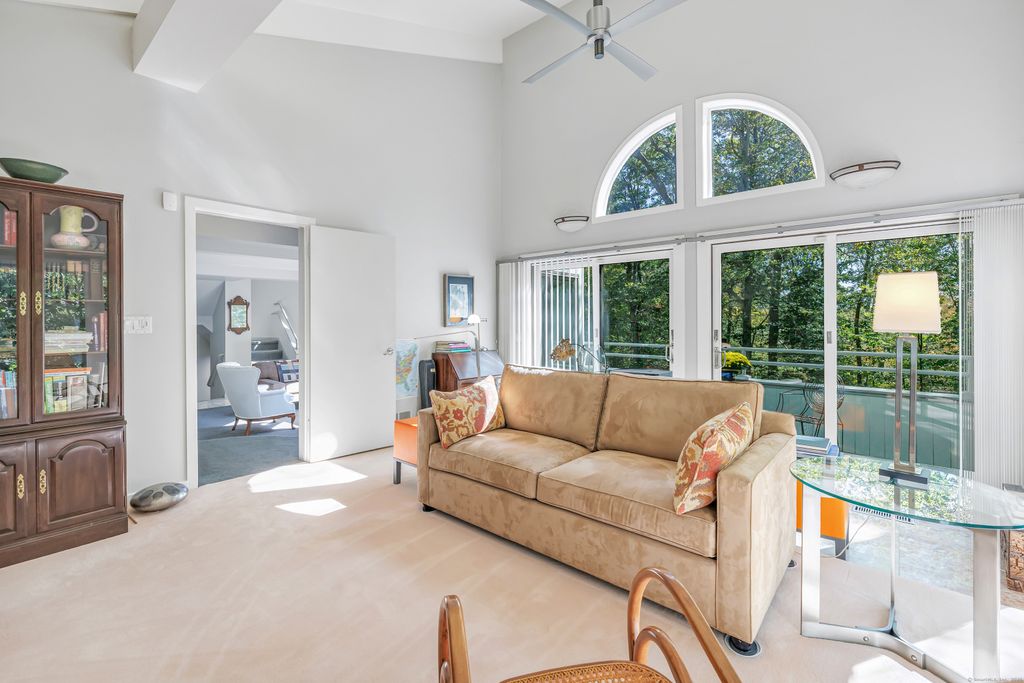 Tucked into the scenic hillside of Hamden's sought-after Blue Trail neighborhood-on a street lined with architecturally distinctive homes-this stunning, one-of-a-kind contemporary offers the perfect balance of design, comfort, and natural beauty. A versatile floor plan and thoughtful updates make this home truly move-in ready. The first-floor primary suite provides ease and privacy, while the two-story living room impresses with soaring ceilings, a dramatic floor-to-ceiling fireplace, and walls of glass that frames tranquil woodland views. The gourmet eat-in kitchen is a chef's dream, featuring Sub-Zero refrigeration, Miele double ovens, a Jenn-Air gas cooktop, Miele dishwasher, and a large workstation sink-all set within a warm, modern design that flows seamlessly into the open living spaces. Upstairs, a loft-style family room offers flexible space for a home office, library, or media area. Two spacious bedrooms and beautifully renovated spa-like bath complete the upper level. The bathroom renovation (2009) includes an expanded layout with a 6-foot soaking tub, architect-designed custom cabinetry in quarter-sawn oak, new windows, hidden storage, a wall of mirrors, and Restoration Hardware fixtures-a thoughtful blend of craftsmanship and style. A walk-out lower level provides a bright, private area ideal for an office, studio, or au pair suite with its own entrance.