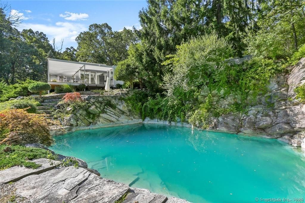 The Otnes House is a true floating oasis and now available as a summer rental! This rolling property overlooks nearly 3.5 acres, complete with a one-of-a-kind pool carved into a natural stone quarry with beautiful surrounding gardens. John Johansen of the celebrated Harvard Five designed this mid-century modern for famous collage artist Fred Otnes, who lived here for over 50 years. Walls of glass bring in beautiful natural light; expansive decks & pergolas have created an open floor plan concept to bring the outside in. The renovated kitchen features Bauformat cabinetry and high end European appliances, and the primary bedroom has a sitting room, office area and attached artist studio. Two additional bedrooms and two bathrooms complete the main house, and adjacent to the home is a two-car garage with ample room for storage or an additional studio space. The property is approximately 50 miles/90min from New York City and 5 minutes to a Metro-North stop which takes you directly to Grand Central. Redding offers an abundance of trails, nearby shops and restaurants of Westport, Darien and Ridgefield. A wonderful place to call home.