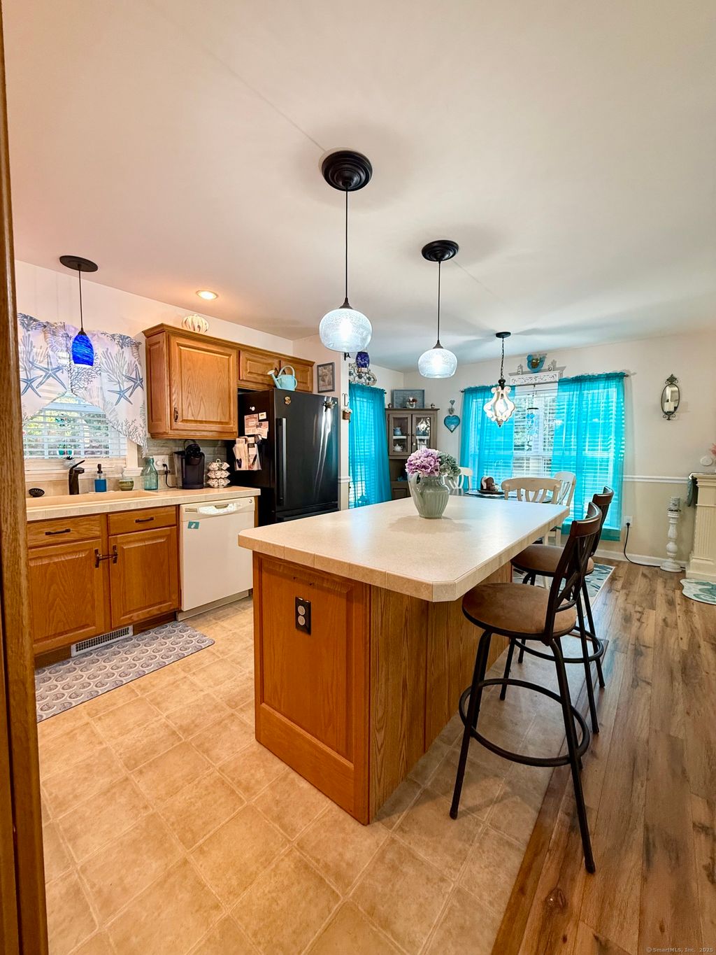 Welcome to 3 Cliff Road - a beautifully maintained 2-bedroom, 2-bath home tucked on corner lot within the desirable 55+ community of Stonegate Village. Bright, welcoming, and move-in ready, this home blends coastal New England charm with practical single-level living. Step inside to find an open-concept layout where natural light fills the spacious living and dining areas. The kitchen features a generous center island, warm oak cabinetry, and stylish pendant lighting-perfect for casual dining or entertaining. The adjoining dining area and living room flow seamlessly, creating a space that feels both airy and inviting. The primary suite is a peaceful retreat complete with a large en-suite bath featuring a soaking tub, separate shower, and large vanity. A second full bath showcases modern updates with a wood-accent wall and timeless finishes. The conveniently located laundry/mudroom offers extra storage and easy access to the outdoors. With its thoughtful floor plan, neutral finishes, and low-maintenance living, efficient propane heating, and central air this home offers the perfect blend of comfort and convenience.