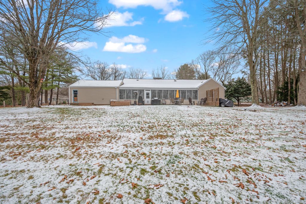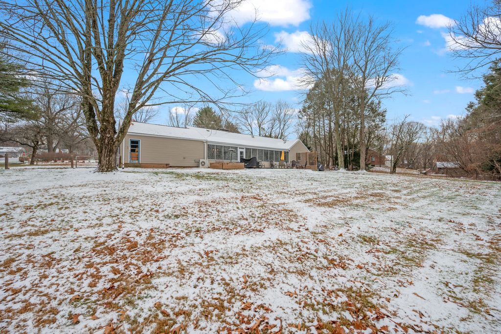 This is the one that is going to put a smile on your face! One floor living at its best is what you'll find at 27 Sunset Rd, Ellington, CT. Even the laundry is on the main floor! Every room in this home has been upgraded in the past few years. Paint, flooring, trim, lighting, plumbing has been upgraded in the kitchen, living room, dining room, bathrooms, enclosed porch, bedrooms, and finished lower level. Let's start with the open floor concept... The living room with woodstove and hardwood flooring is seamlessly connected to the dining room. The dining room, with hardwood flooring is open to the kitchen. White cabinets, updated appliances and lighting fixtures, snack bar and hardwood flooring complete the kitchen. All 3 bedrooms also have hardwood flooring. The primary bedroom has double closets, updated wood trim, lighting and ceiling fan. The full bath boasts new vanity, ship lap, mirror, lighting and plumbing fixtures and a tub/shower unit with tile surround. Updates to the sunporch include new flooring, wood ceiling, lighting and ceiling fans. There is another fireplace in the family room in the lower level. An oversized garage with walk up access to a large storage area is an awesome bonus. The patio, firepit area, and the storage shed enhance the spacious level back yard that is perfect for barbecues, lawn games or relaxing and watching the sun set! This home is conveniently located just minutes from Ellington Center, Big Y shopping plaza and more.