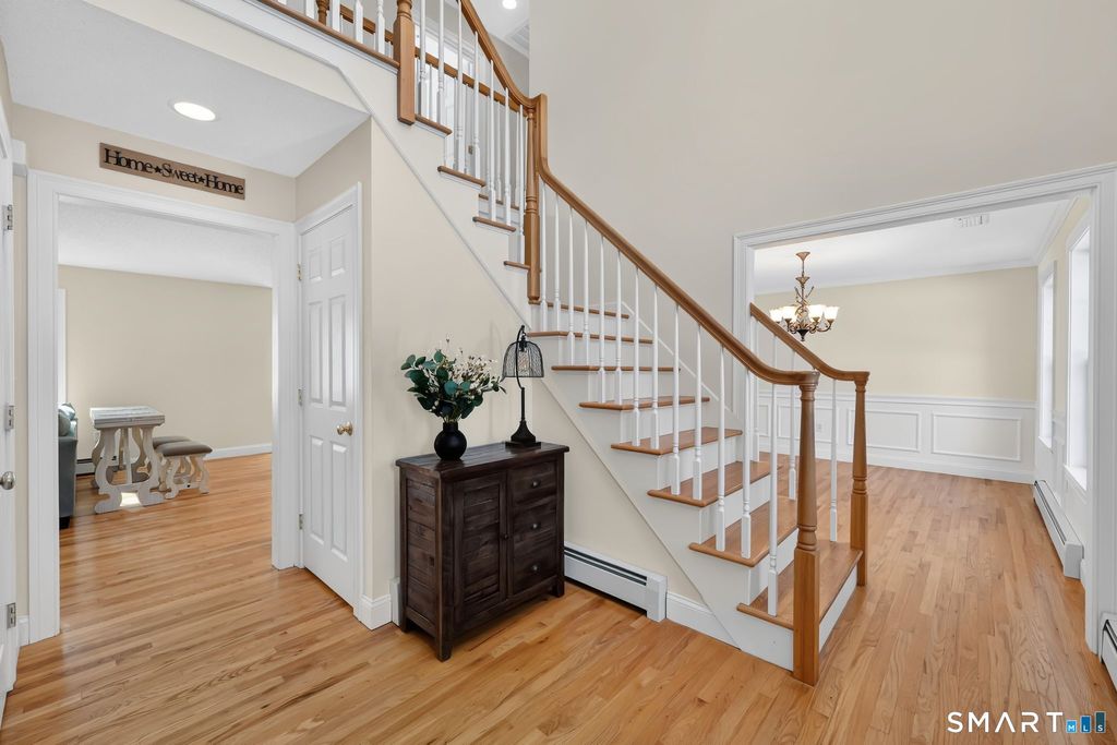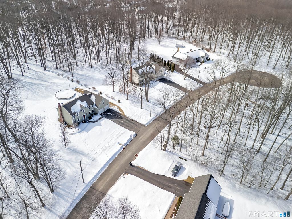 Stunning home nestled in a prime cul-de-sac location with potential for 5 bedrooms! A dramatic two-story foyer makes a striking first impression, unveiling a beautifully designed open-concept floor plan ideal for entertaining. The expansive kitchen is the heart of the home, featuring a large center island with seating, pantry, dining area, and seamless flow into the living room. Hardwood floors extend throughout the main level, enhancing the home's warmth and elegance. The formal dining room is beautifully appointed with wainscoting and crown molding. A private 1st floor office with French doors is ideal for working at home. A well-designed mud area has a half bath, 2 closets and a separate staircase providing access to the bonus room. The oversized 2 car garage offers extended storage for tools and equipment with double door walkout access to the backyard. Upstairs, the spacious primary suite features a walk-in closet and a luxurious bath with double sinks, whirlpool tub, and separate shower. 3 additional bedrooms offer ample closet space and the main bath includes double sinks for added convenience. The versatile bonus room can easily serve as a 5th bedroom or family room. A park-like backyard is perfect for relaxing or entertaining, complete with a deck overlooking an above-ground pool for summer enjoyment. Conveniently located on a cul-de-sac street just minutes to UCONN, Twin Hills Country Club and Hartford. Pristine condition, spacious design, and exceptional location!