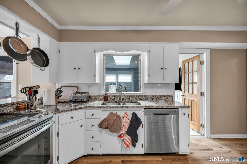 Welcome to 304 Huntington Road, nestled in Stratford's sought-after Paradise Green neighborhood! This charming Cape Cod-style home offers the perfect blend of classic character and modern updates. Step inside to discover gleaming hardwood floors throughout, a spacious living room anchored by a cozy brick fireplace, and an open dining area ideal for entertaining. The well-appointed kitchen features granite countertops, stainless steel appliances, and ample cabinet space. A first-floor bedroom and full bath provide convenient single-level living, while the second floor offers two spacious bedrooms and a full bathroom - perfect for family or guests. Enjoy year-round comfort in the heated sunroom, currently used as a home office/flex space, with skylights and beautiful views of the backyard. The heated lower level adds even more living space with a recreation room and additional room ideal for a home office, gym, or playroom. Outside, a large deck overlooks a spacious backyard - perfect for summer entertaining. The oversized 2-car garage and driveway with room for 6+ vehicles make parking a breeze. Additional highlights include updated windows, a new oil tank, and a prime location just minutes from downtown Stratford, shopping, dining, and major commuter routes. Don't miss this Paradise Green gem - schedule your showing today!