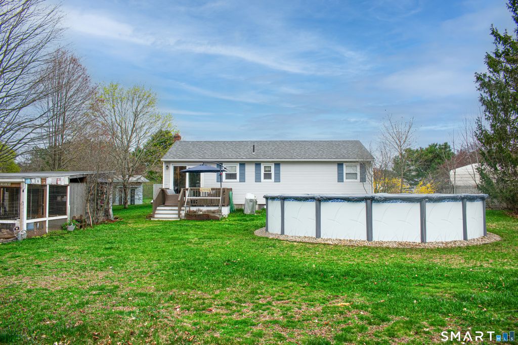 A Homesteader's Dream-Coming Soon! ** Additional square footage in the finished basement totaling ~1600 sq. ft. ** Move-in-ready 3-bedroom ranch (plus bonus room in the basement) set on a quiet cul-de-sac just minutes from Rt. 395 and the MA border-offering easy commuting with a peaceful country feel. Perfect for a homesteading lifestyle, this property features garden beds, established perennials, mature sugar maples ready for tapping, a large custom chicken coop with enclosed run, and a fenced livestock area. Tall pines create a private, wooded backyard-all on just over a half acre in Thompson's Residential Rural Agricultural District. Recent updates include a 2016 roof, new well pump (2024), re-fracked well (2017), and new water heater (2025). The eat-in kitchen has been updated with oak cabinetry, new countertops, backsplash, and stainless appliances. The home also offers a full bath, cozy open living room, new front and back porches, front walkway, and a 24' above-ground pool (2024). The mostly finished lower level adds a large family room, bonus room with walk-in-style closet, new flooring, and walk-out access to the backyard. Additional features include a fire pit area, storage shed, playhouse, and a crushed stone driveway.