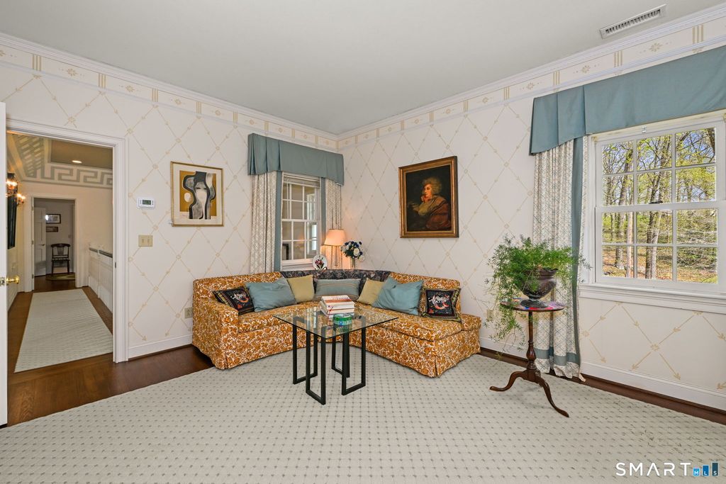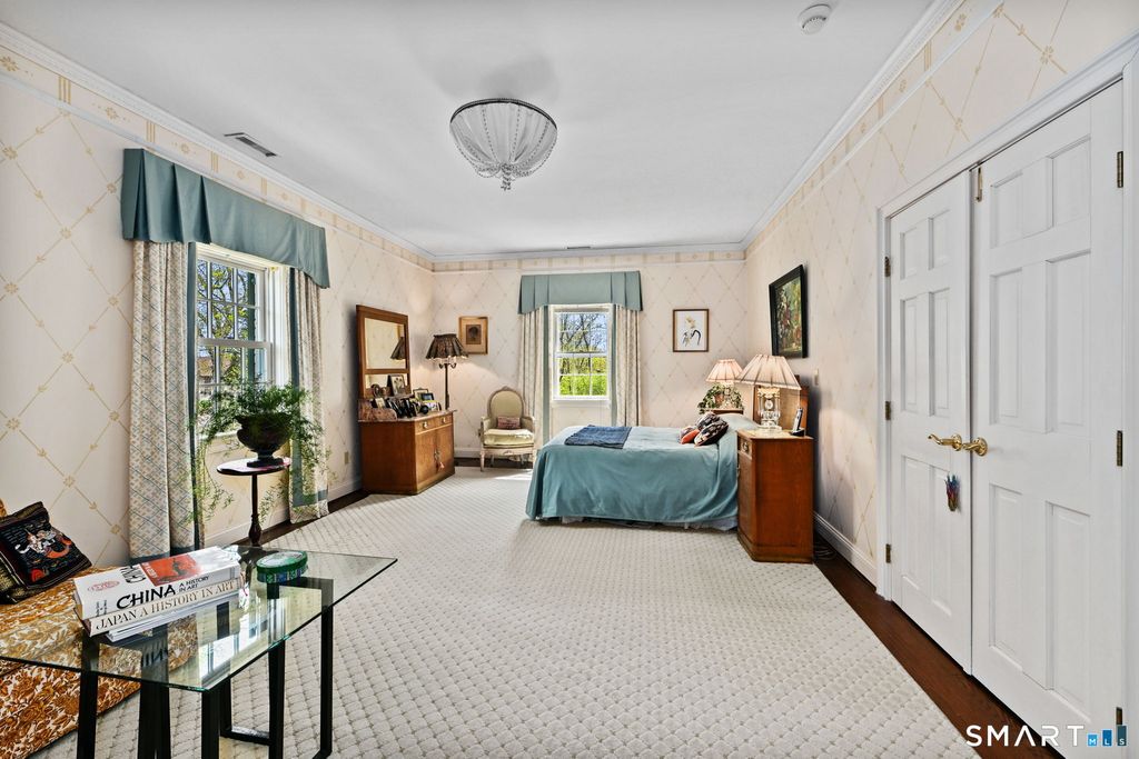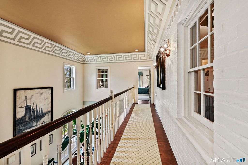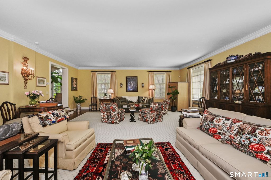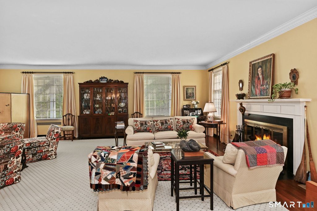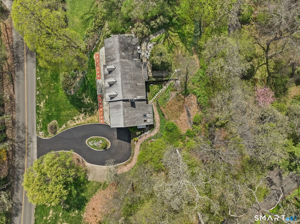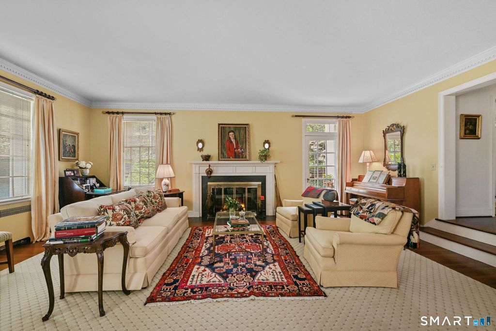 Set on over 1.6 beautifully landscaped acres in a coveted Greenwich location, this exceptional four-bedroom residence offers space, flexibility, and timeless appeal. A dramatic two-story entry with a sweeping balcony sets the tone, leading into an oversized step-down living room with a fireplace, abundant natural light, and doors that open seamlessly to a patio perfect for indoor-outdoor living and entertaining. The home features four bedrooms, including a gracious primary suite complete with a private makeup enclave and a walk-in closet as well as a well-appointed guest suite with its own sitting room-ideal for visitors or extended stays. One of the bedrooms is currently configured as a home office, offering versatility for today's lifestyle. At the heart of the home, the eat-in kitchen with fireplace flows effortlessly into the dining area, with additional access to the outdoor patio. An attractive, elegant library provides the perfect retreat for quiet moments. A standout feature is the separate studio space with its own entrance, full bathroom, kitchen corner, and garage access-ideal for guests, an au pair, creative workspace, or private home office. Set on 1.6 acres of natural landscaping, this property offers privacy, tranquility, and the rare opportunity to enjoy a true Greenwich lifestyle. Easy 20 minute walk to train station.